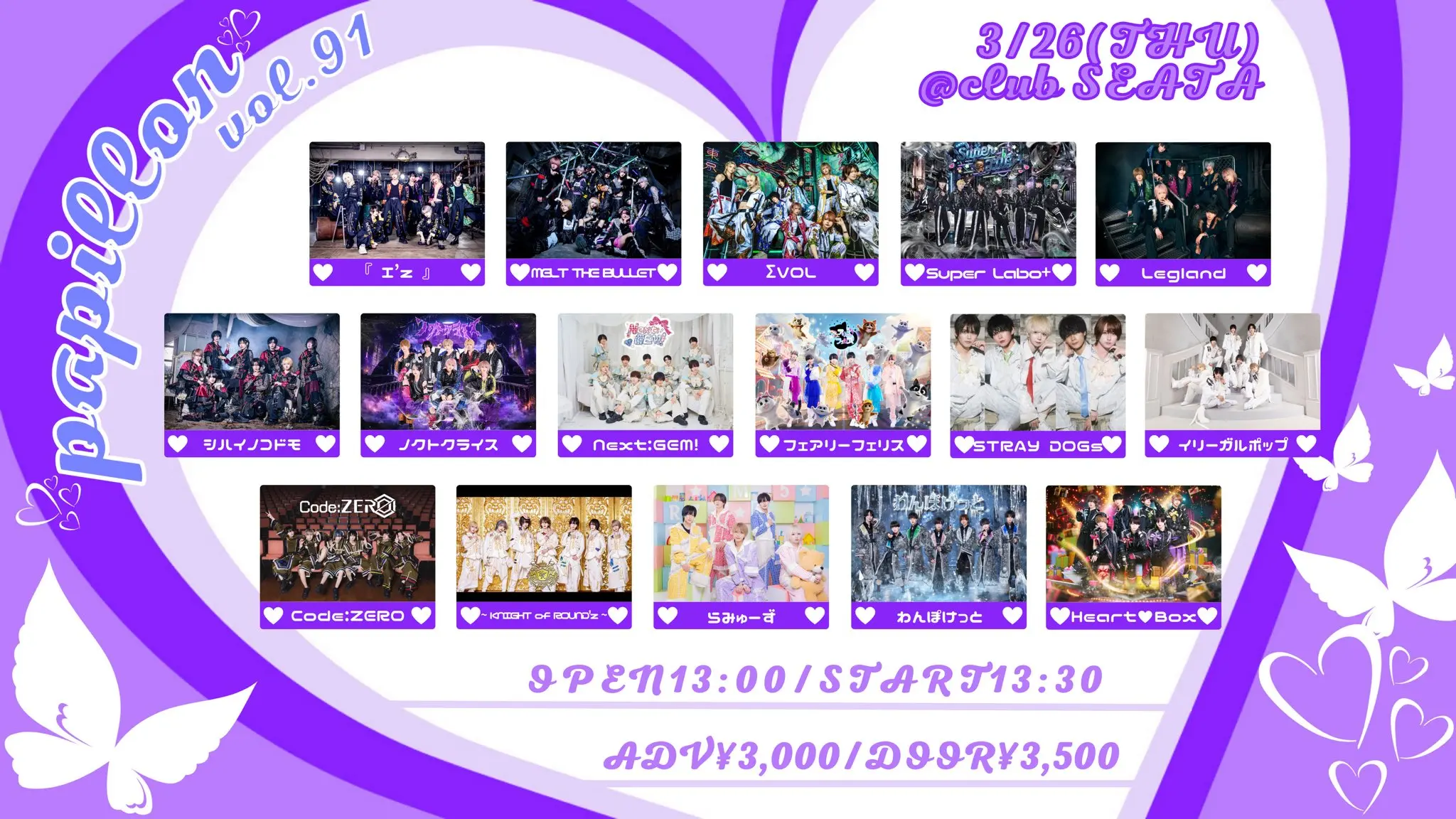 出演者 VINANSHI / 双極スペクトラム / サドマゾ / SAD originals. / ピーターパンシンドローム / MELT THE BULLET / 『 I’z 』 / マッシュアップ / ΣVOL / Magi♡9 / サクラサク / Melty×Mellow / バトラブ! / THE PINK “H” CKET / Heart❤︎Box / シハイノコドモ / EVA.CoN / ノクトクライス / SS/AW / jump street / Next:GEM! / STRAY DOGs / レミニセンスパレード / .Roach / イリーガルポップ / Diamond・QueeN / ユメカウツツカ / i♡toxic / Legland / Code:ZERO / わんぽけっと