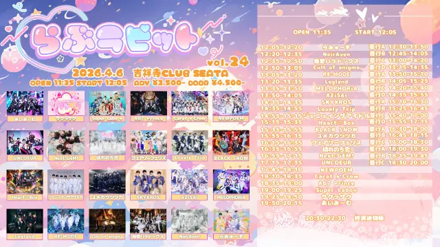 出演者 あいみーむ / Super Labo + / Ab7 Prince / 晴れのち恋 / UNCOEUR / Next:GEM! / BLACK SNOW / MELOPHORiA / Cult of enigma / RE:MODE / AZiSAi / らみゅーず / サクラサク / Carat×Crow / NEWPOEM / フェアリーフェリス / ユメカウツツカ / Heart❤︎Box / ジェニュインザアイドル / Lovely Trip / SKYXROS / Legland / 極愛パラドックス / NoirAven
