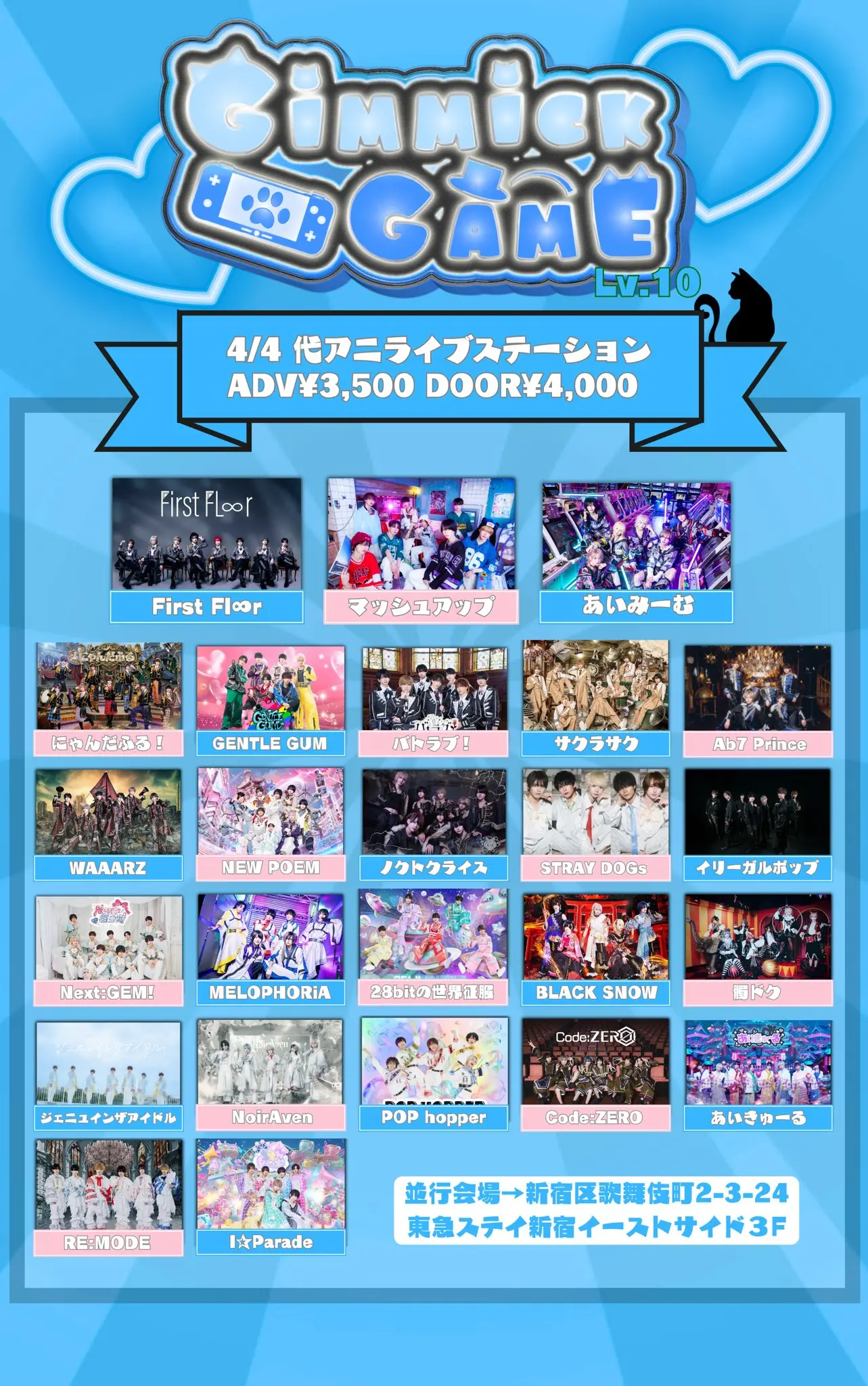 出演者 マッシュアップ / WAAARZ / BLACKSNOW / ジェニュインザアイドル / イリーガルポップ / 28bitの世界征服 / Ab7Prince / NEWPOEM / STRAY DOGs / Code:ZERO / にゃんだふる! / I9L / First Fl∞r / 髑ドク / サクラサク / あいみーむ / MELOPHORiA / RE:MODE / ノクトクライス / Next:GEM! / バトラブ! / I☆Parade / GENTLE GUM / POP hopper / NoirAven