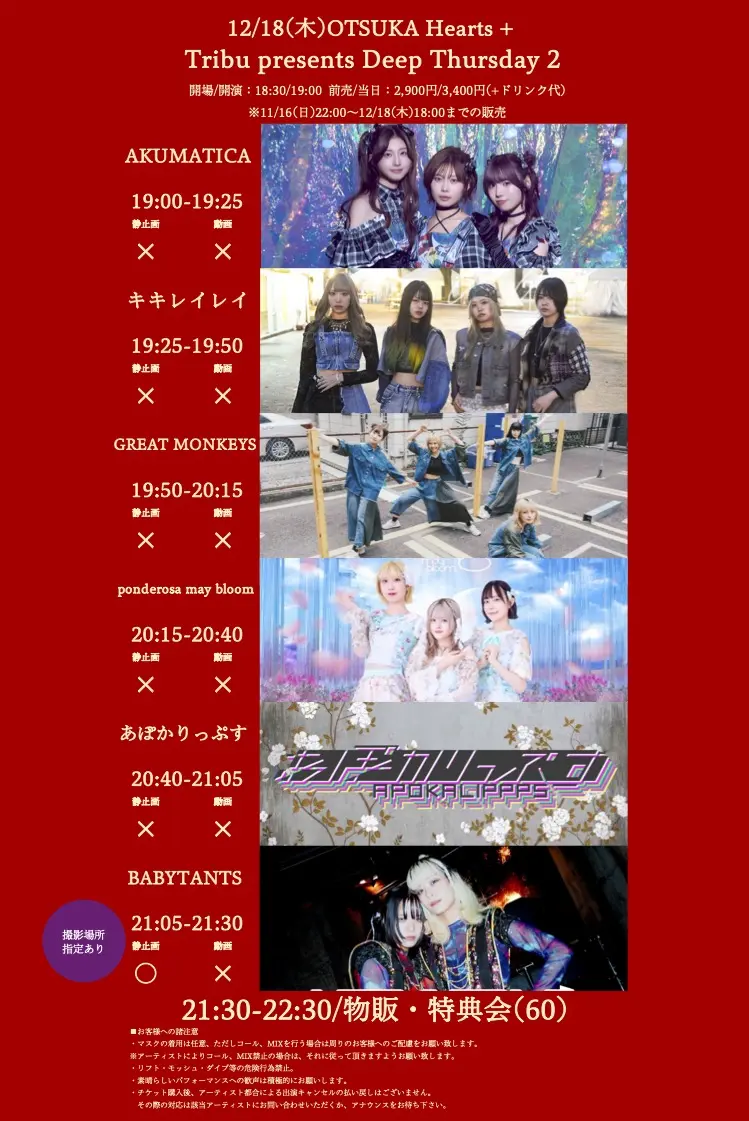 出演者 ponderosa may bloom / AKUMATICA / キキレイレイ / GREAT MONKEYS / あぽかりっぷす / BABYTANTS