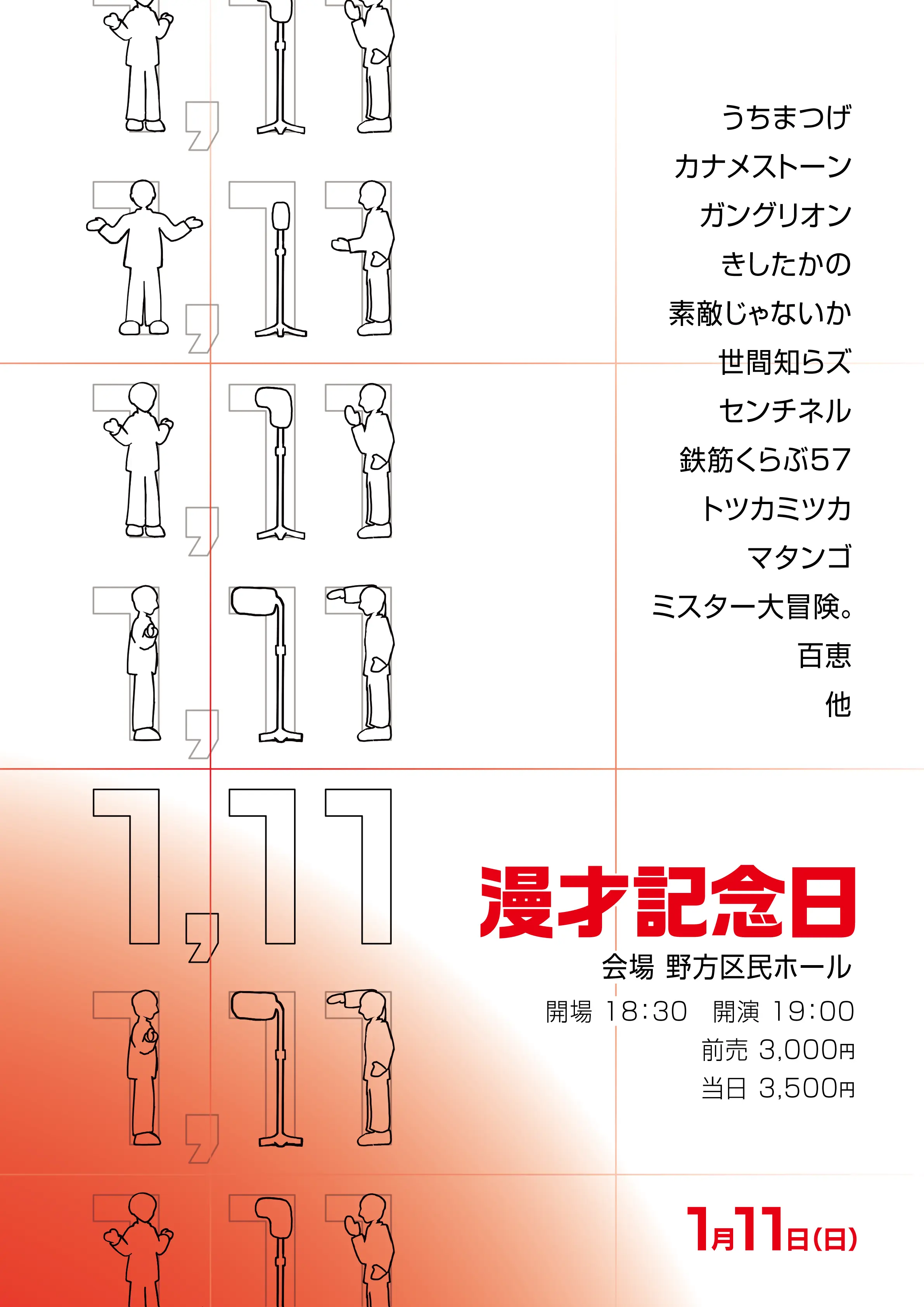 出演者 うちまつげ / カナメストーン / ガングリオン / きしたかの / 鉄筋くらぶ57 / トツカミツカ / マタンゴ / ミスター大冒険。 / 百恵 / 素敵じゃないか / 世間知らズ