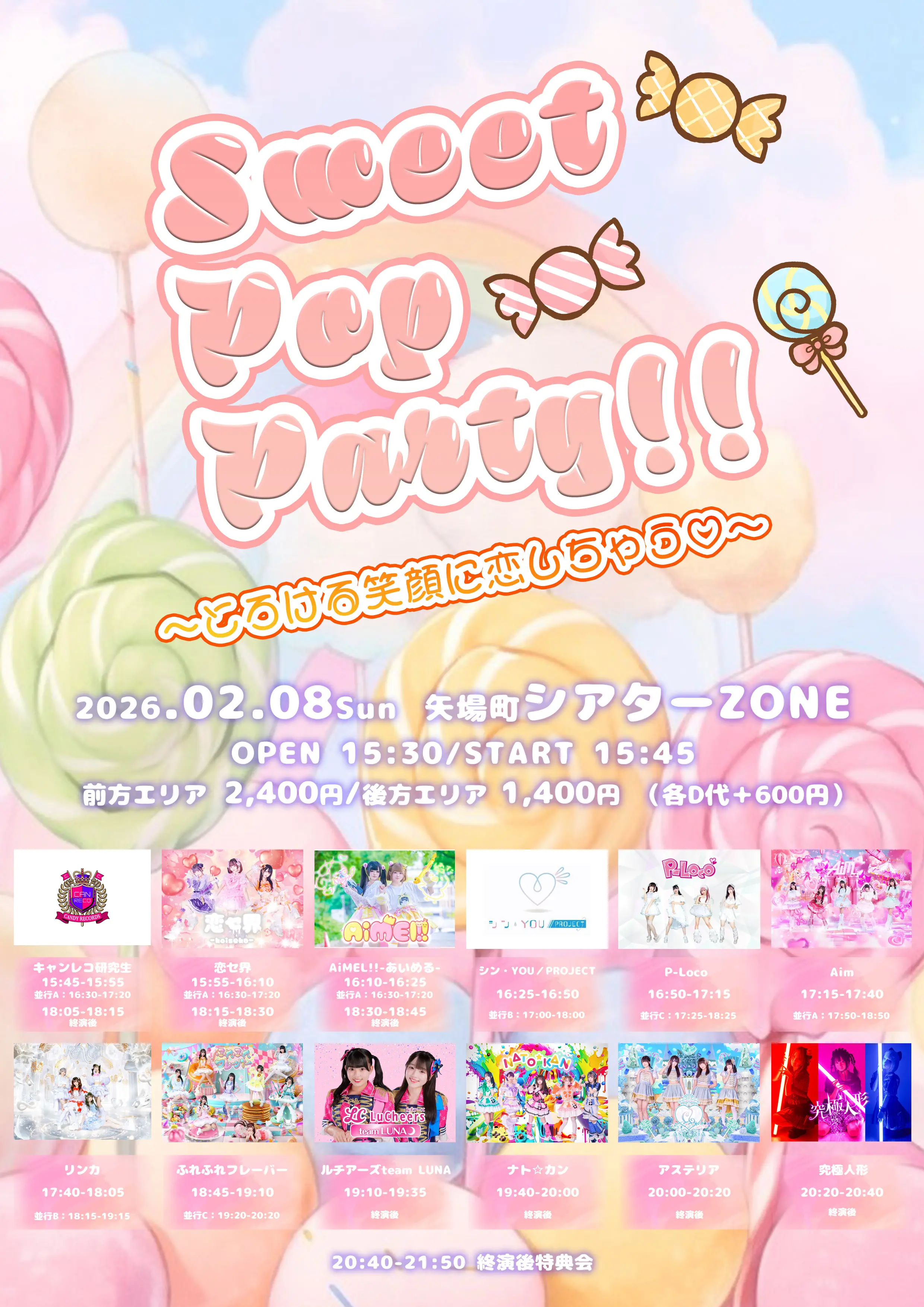 出演者 ナト☆カン / 究極人形 / アステリア / プリンセス物語 / 恋セ界 / AiMEL!!-あいめる- / MeringueHack / 賽の目。 / Love it ice / リンカ / ラプシャトー / sweet♡union / キャンレコ研究生 / AMO million / mofu/mofu / アイア―ル / Aim / HATE and TEARS / モードラ / いざ参らん / ふれふれフレーバー