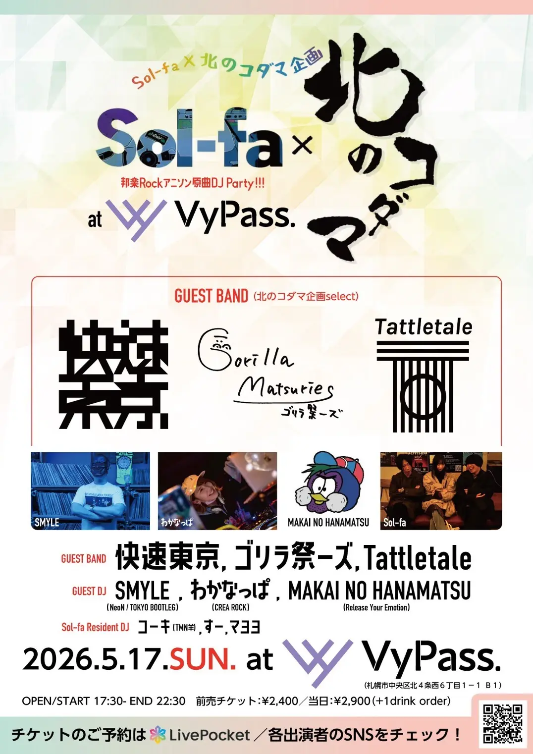 出演者 Sol-fa Resident DJ:コーキ(TMN羊) / すー /マヨヨ / SMYLE / MAKAI NO HANAMATSU / わかなっぱ / 快速東京 / ゴリラ祭ーズ / Tattletale