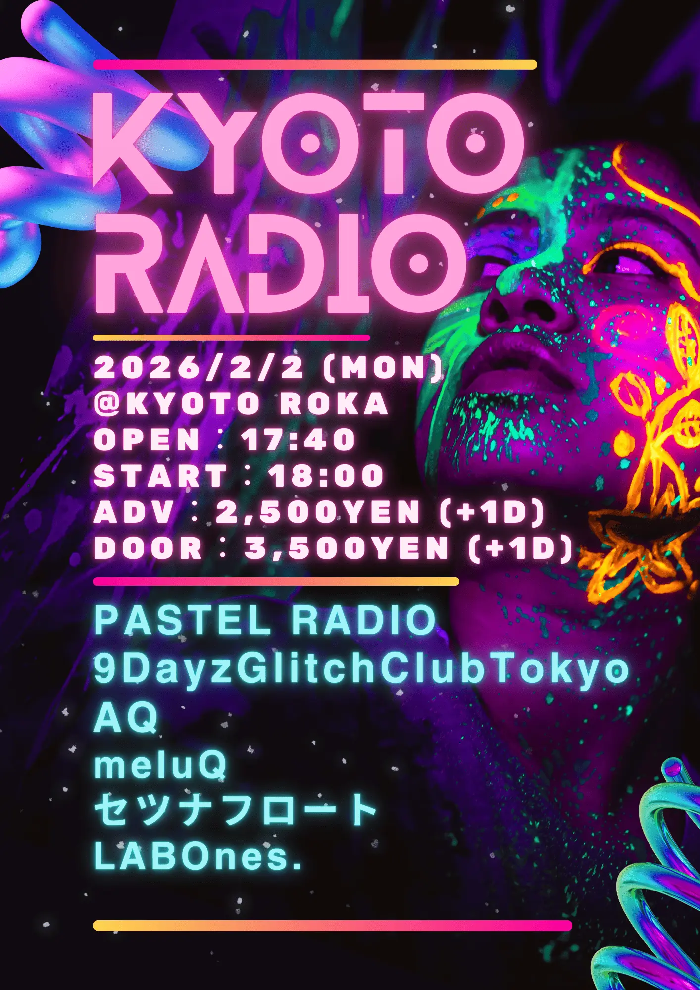 出演者 PASTEL RADIO / 9DayzGlitchClubTokyo / meluQ / AQ / LABOnes. / セツナフロート