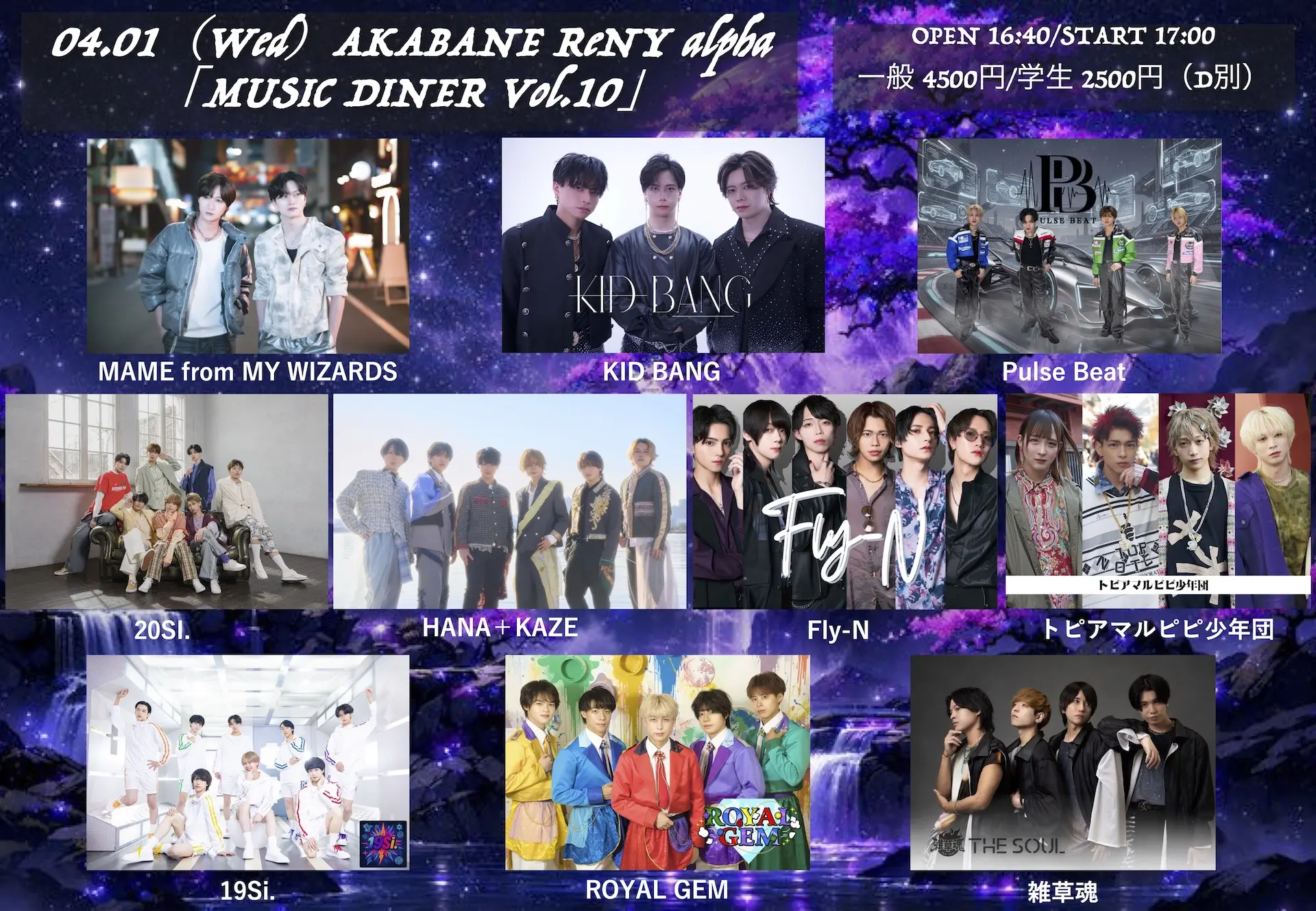 出演者 My SnoozzZ / MY chunS / ROYAL GEM / ABYSS / 君色パティシエ / Place Order / 永井瑠聖(tasty rose) / トピアマルピピ少年団 / アニノマス / NØCTURИ / SHOTA / DAIJU / Pulse Beat / Mirror5