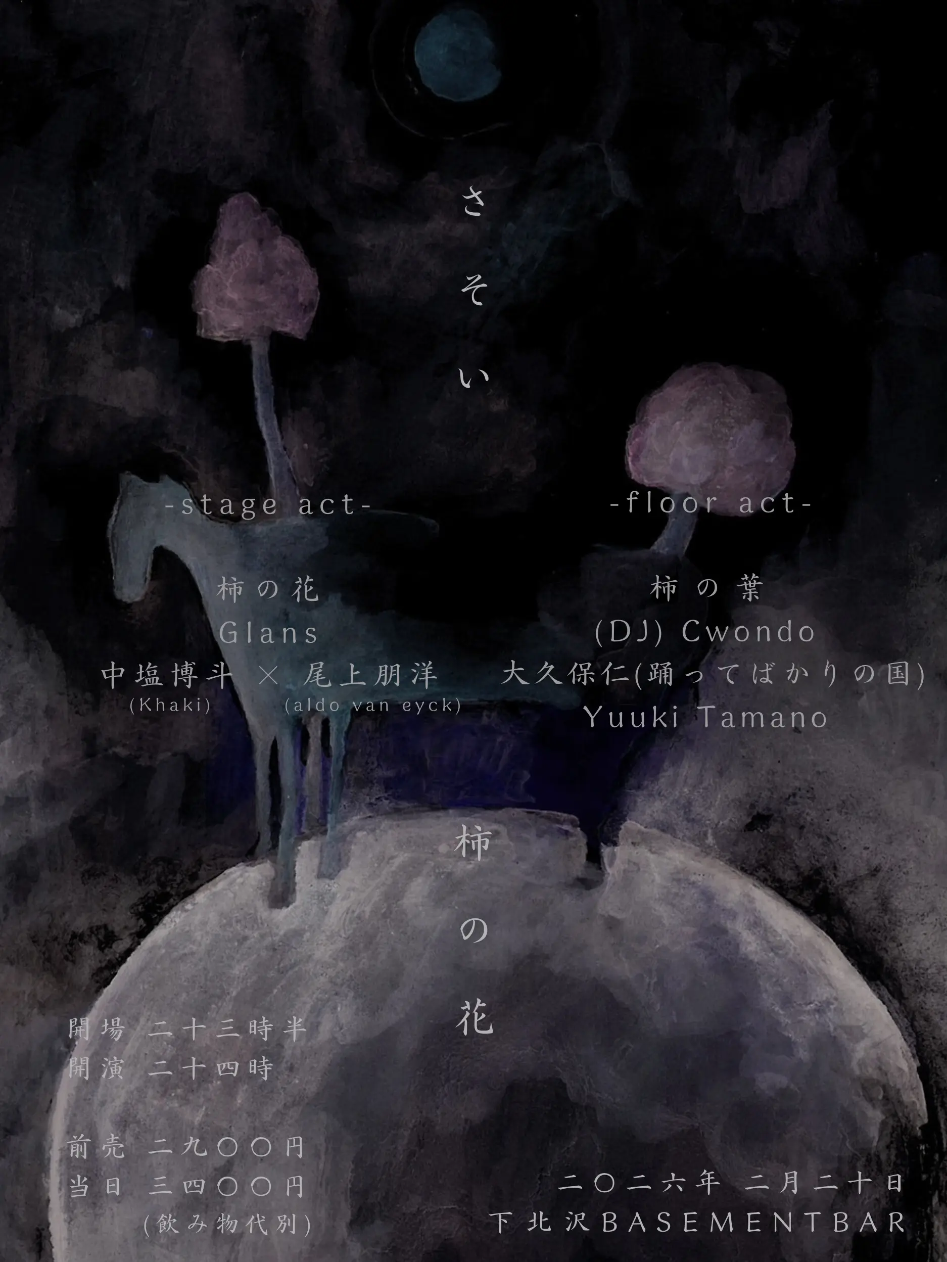 出演者 柿の花 / Glans / 中塩博斗(Khaki) / 尾上朋洋(aldo van eyck) / 大久保仁(踊ってばかりの国) / Yuuki Tamano / Cwondo(DJ)