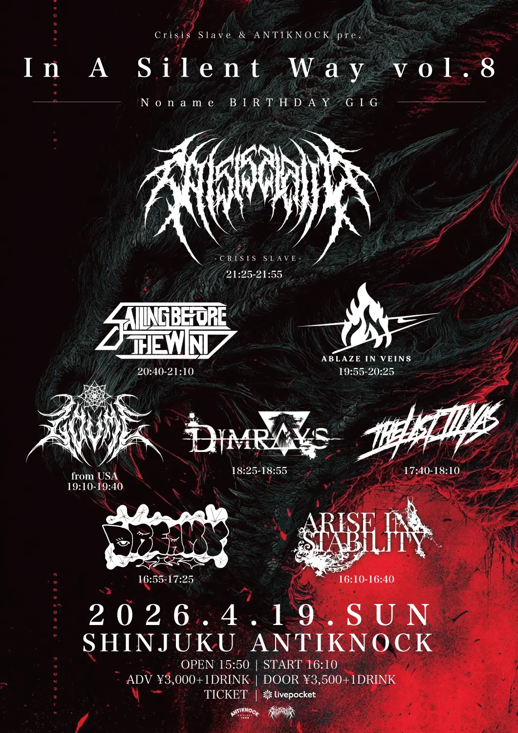 出演者 DREAMY / Crisis Slave / Zoume / Sailing Before The Wind / Dimrays / THE LAST ILLYAS / ABLAZE IN VEINS / Arise in Stability