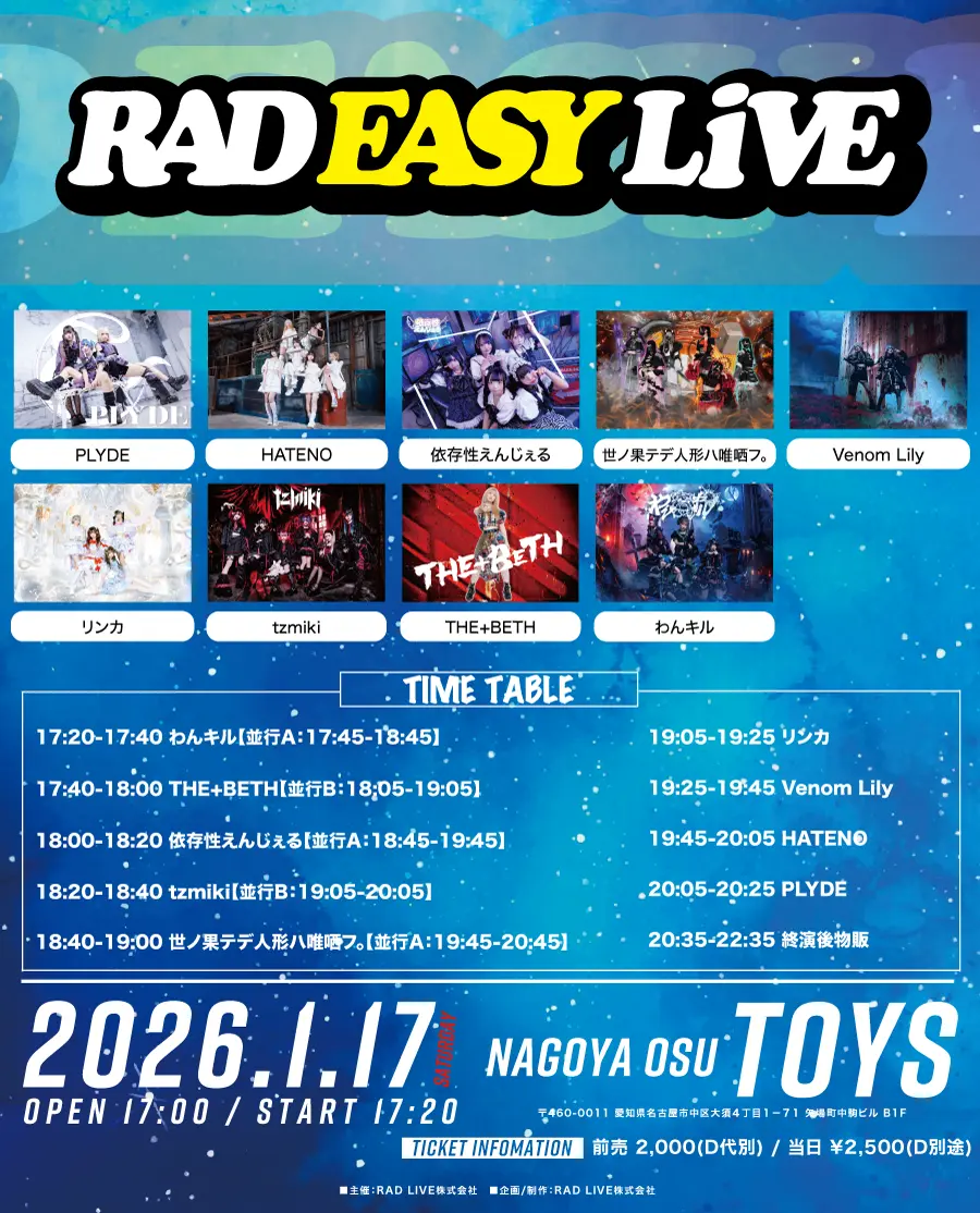 出演者 依存性えんじぇる / Venom Lily / わんキル / HATENO / リンカ / tzmiki / PLYDE / THE+BETH / 世ノ果テデ人形ハ唯哂フ。