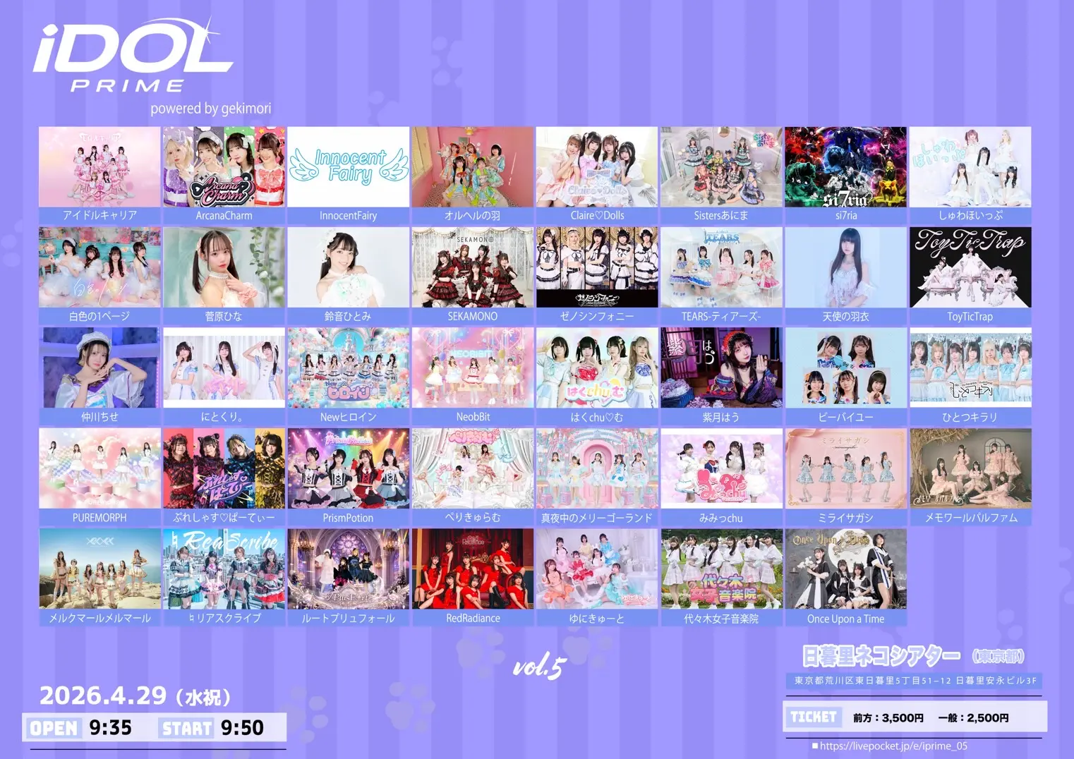 出演者 アイドルキャリア / ArcanaCharm / InnocentFairy / オルヘルの羽 / Claire♡Dolls / Sistersあにま / si7ria / しゅわほいっぷ / 白色の1ページ / 菅原ひな / 鈴音ひとみ / SEKAMONO / ゼノシンフォニー / TEARS-ティアーズ- / ToyTicTrap / 仲川ちせ / にとくり。 / Newヒロイン / NeobBit / はくchu♡む / 紫月はう / ビーバイユー / ひとつキラリ / PUREMORPH / ぷれしゃす♡ぱーてぃー / PrismPotion / ぺりきゅらむ / 真夜中のメリーゴーランド / みみっchu / ミライサガシ / メモワールパルファム / メルクマールメルマール / ♮リアスクライブ / ルートプリュフォール / ゆにきゅーと / 代々木女子音楽院 / Once Upon a Time / 天使の羽衣