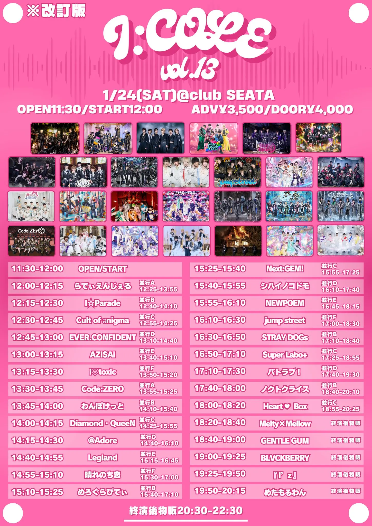 出演者 めたもるわん / 『 I’z 』 / BLVCKBERRY / GENTLE GUM / Melty×Mellow / Heart❤︎Box / ノクトクライス / バトラブ! / Super Labo+ / STRAY DOGs / jump street / NEWPOEM / シハイノコドモ / Next:GEM! / めろぐらびてぃ / 晴れのち恋 / Legland / @Adore / Diamond・QueeN / わんぽけっと / Code:ZERO / i♡toxic / AZiSAi / EVER.CONFIDENT / Cult of ǝnigma / I⭐︎Parade / らでぃえんじぇる