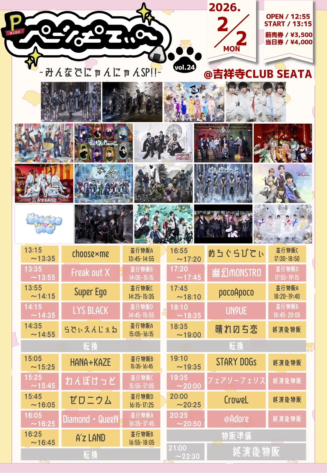 出演者 @Adore / CroweL / フェアリーフェリス / STRAY DOGs / 晴れのち恋 / UN9UE / pocoApoco / 幽幻MONSTRO / めろぐらびてぃ / A’z LAND / Diamond・QueeN / ゼロニウム / わんぽけっと / HANA+KAZE / らでぃえんじぇる / LYS BLACK / Super Ego / Freak out X / choose×me