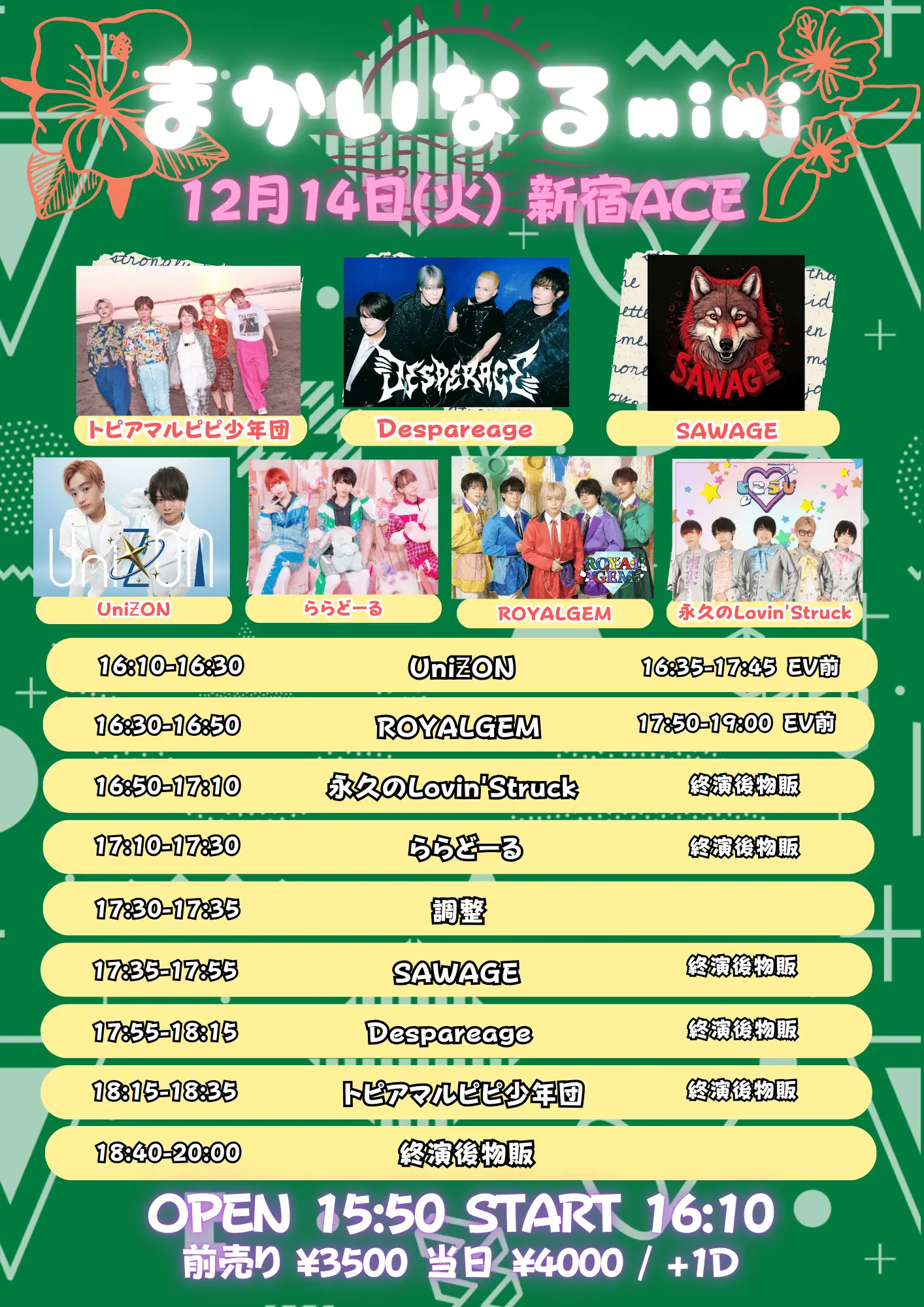 出演者 UniZON / SAWAGE / トピアマルピピ少年団 / ROYALGEM / 永久のLovin'Struck / ららどーる / Despareage