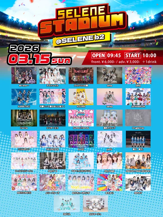 出演者 べるべっとセンテンス / アルテミスの翼 / 【eN】 / 可愛いって言わないと呪う! / buGG / Pafio / フィルフェリーチェ / MATE×MATE! / あくきゅ〜 / alma / KAMAITACI / KOURiN / zanka / じゅじゅ / シンダーエラ / 透色ドロップ / Drug&Drop / NiLUNLOCK / 遥か、彼方。 / Payrin’s / Malcolm Mask McLaren / めろでぃーぷれいす / メリーパレード / ReFLiA / ルルネージュ / われらがプワプワプーワプワ / My_Stage / SUPER JYAPON / アストレイル / JAPANARIZM / ゆえない / RePALY