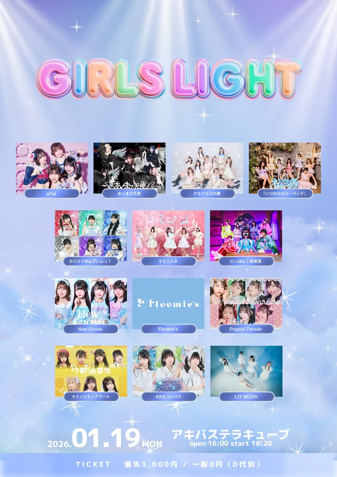 出演者 マイノリティアラート / LIT MOON / 4次元コンパス / カリスマめんざいふっ! / にっぽん!真骨頂 / New Crown / 「いつかのネバーランド」 / キミニハネ / Floomie's / Poppin' Parade / ai*ai / あくまで天使 / アルテミスの翼