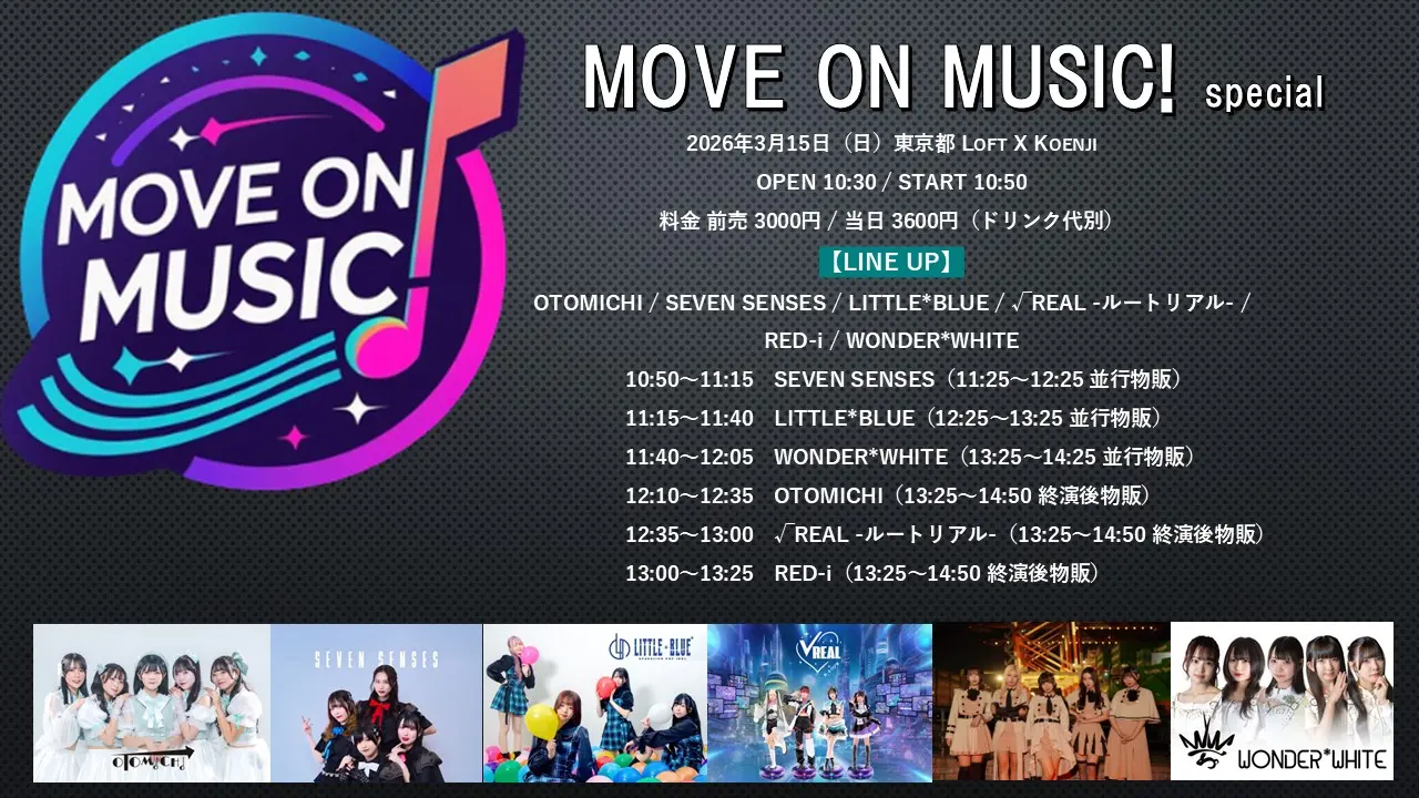出演者 OTOMICHI / SEVEN SENSES / LITTLE*BLUE / √REAL -ルートリアル- / RED-i / WONDER*WHITE