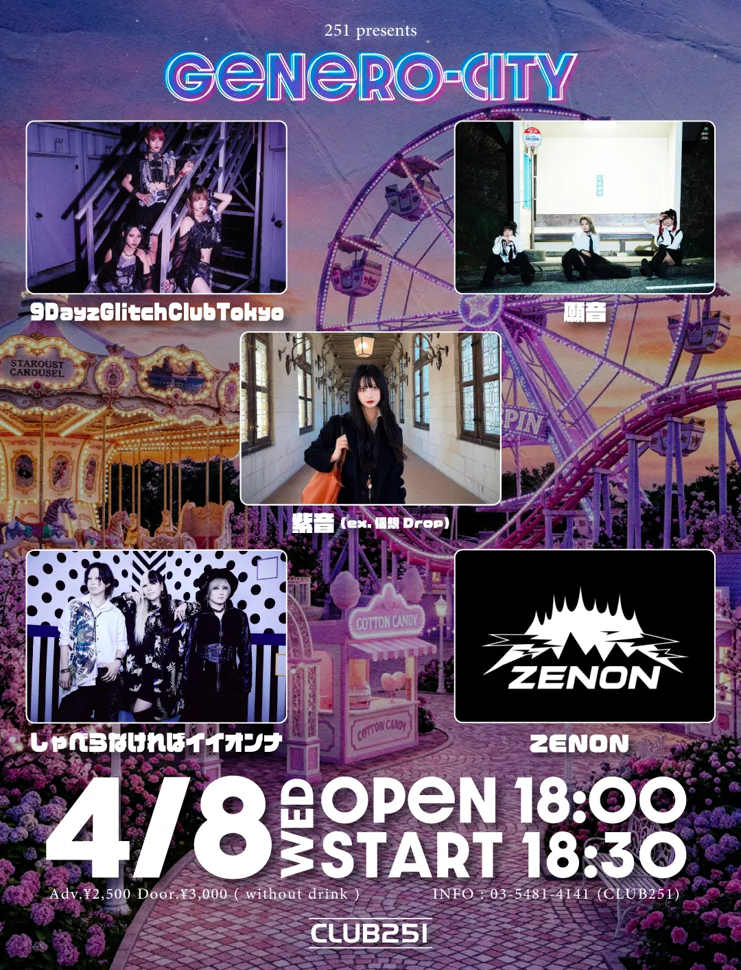 出演者 9DayzGlitchClubTokyo / 願音 / 紫音(ex.偶想Drop) / しゃべらなければイイオンナ / ZENON