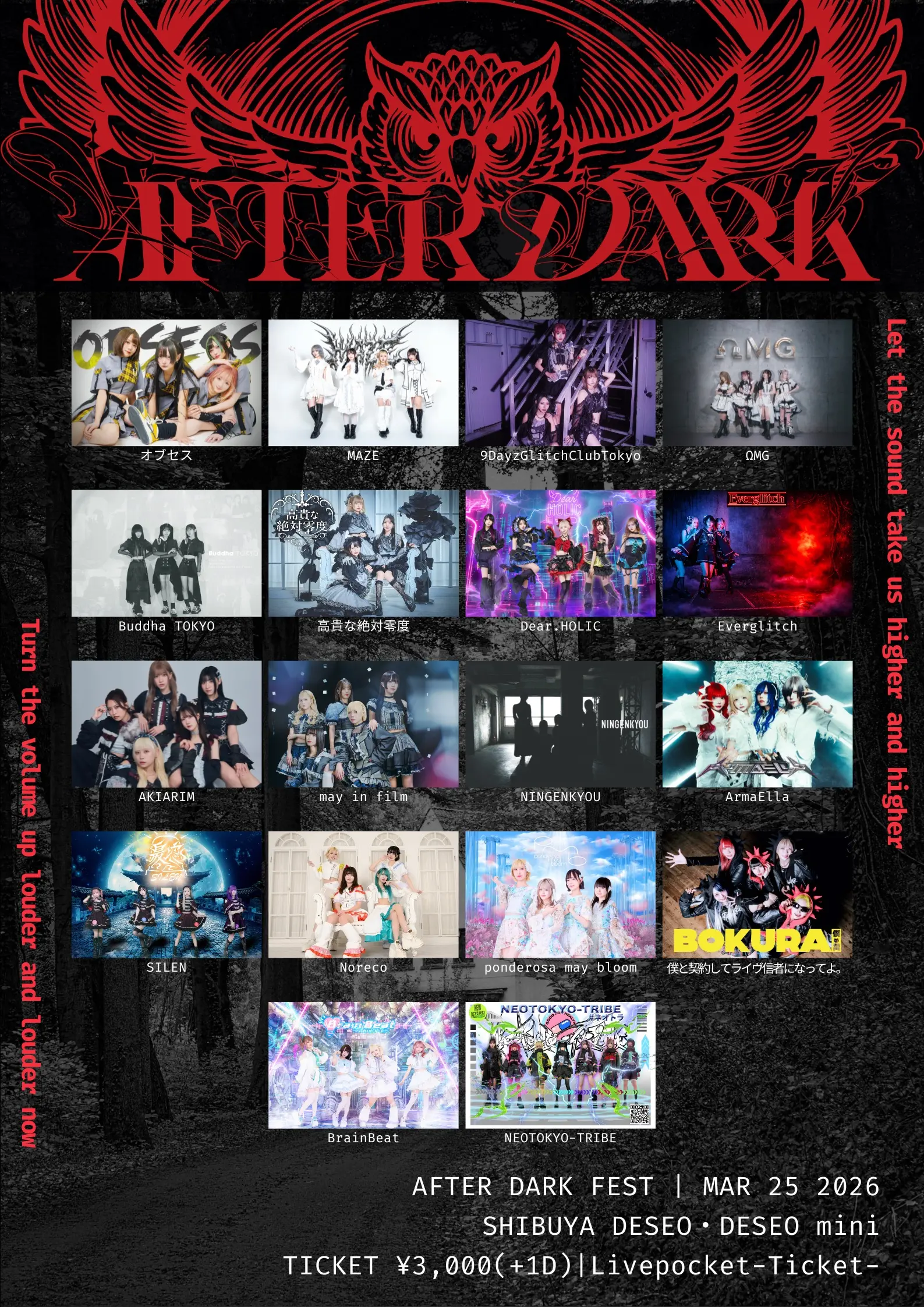 出演者 AKIARIM / ArmaElla / Everglitch / ΩMG / オブセス / 高貴な絶対零度 / SILEN / Dear.HOLIC / 9DayzGlitchClubTokyo / NINGENKYOU / NEOTOKYO-TRIBE / Noreco / BrainBeat / Buddha YOKYO / 僕と契約してライヴ信者になってよ。 / ponderosa may bloom / MAZE / may in film