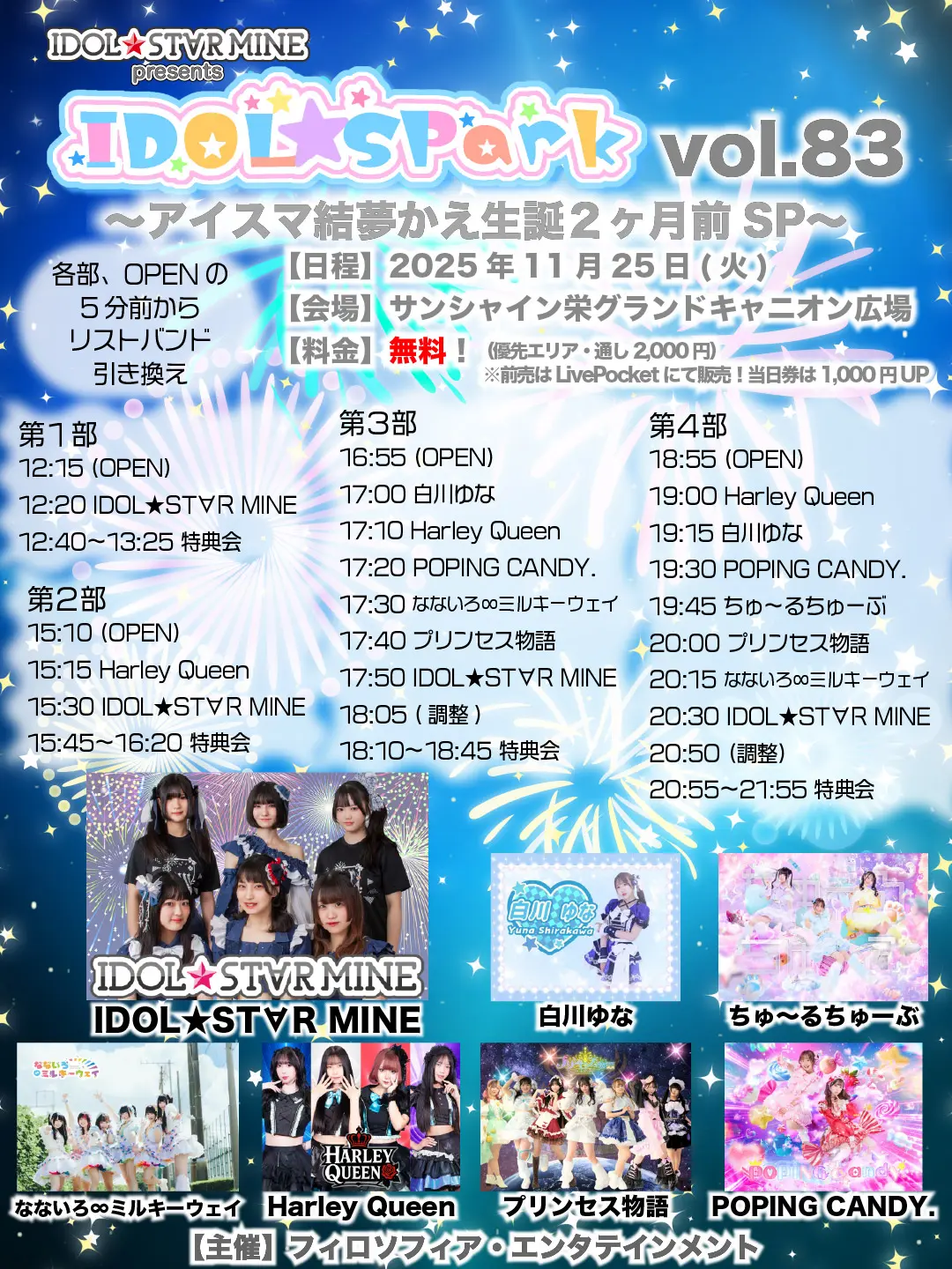 出演者 IDOL★ST∀R MINE / なないろ∞ミルキーウェイ / プリンセス物語 / Harley Queen / 白川ゆな / POPING CANDY. / ちゅ〜るちゅーぶ