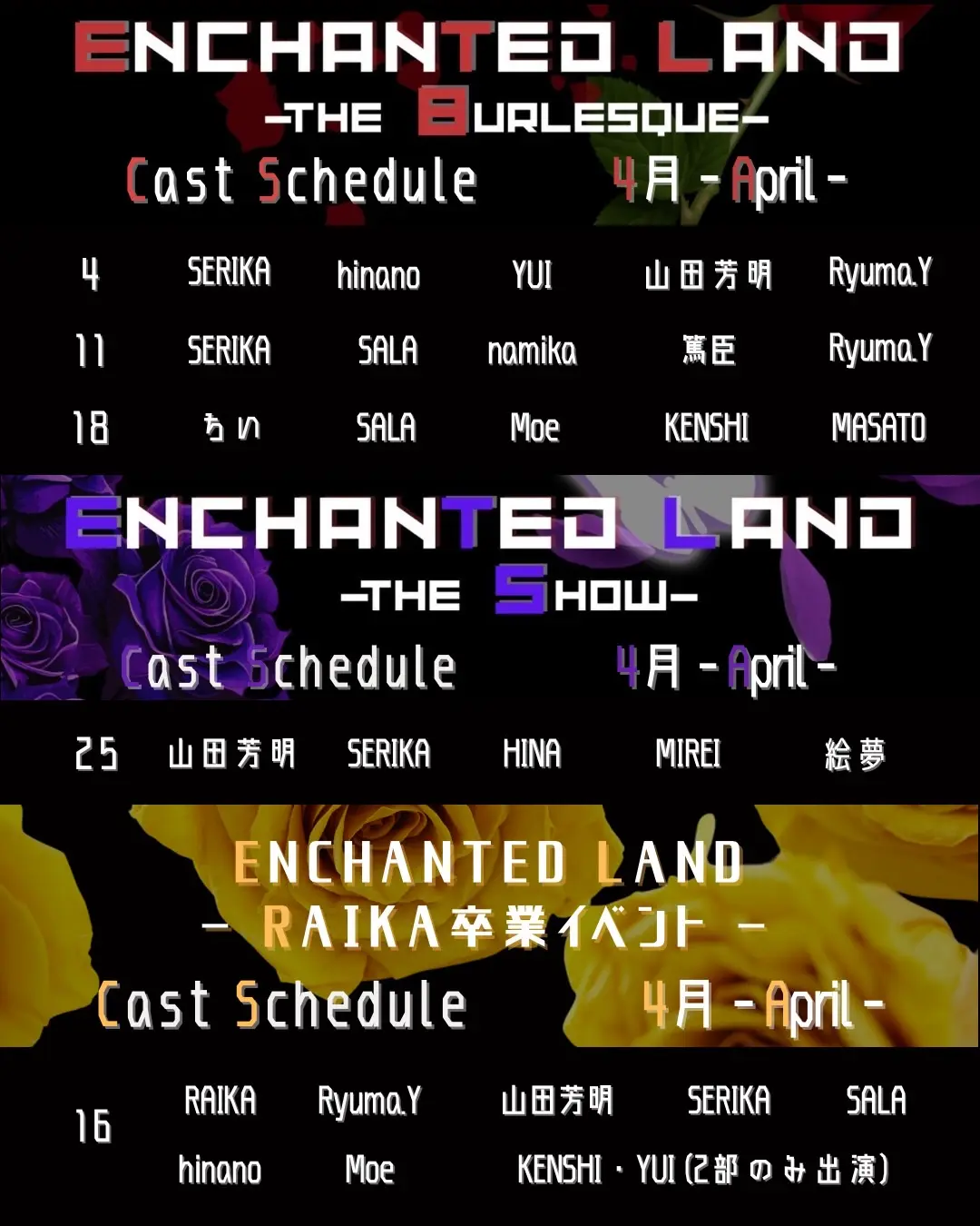 出演者 山田芳明 / KENSHI / 龍馬 / RAIKA / 黒田篤臣 / MASATO / ちい / YUI / Moe / SERIKA / iBu / hinano / SALA / namika / 絵夢 / HINA / MIREI