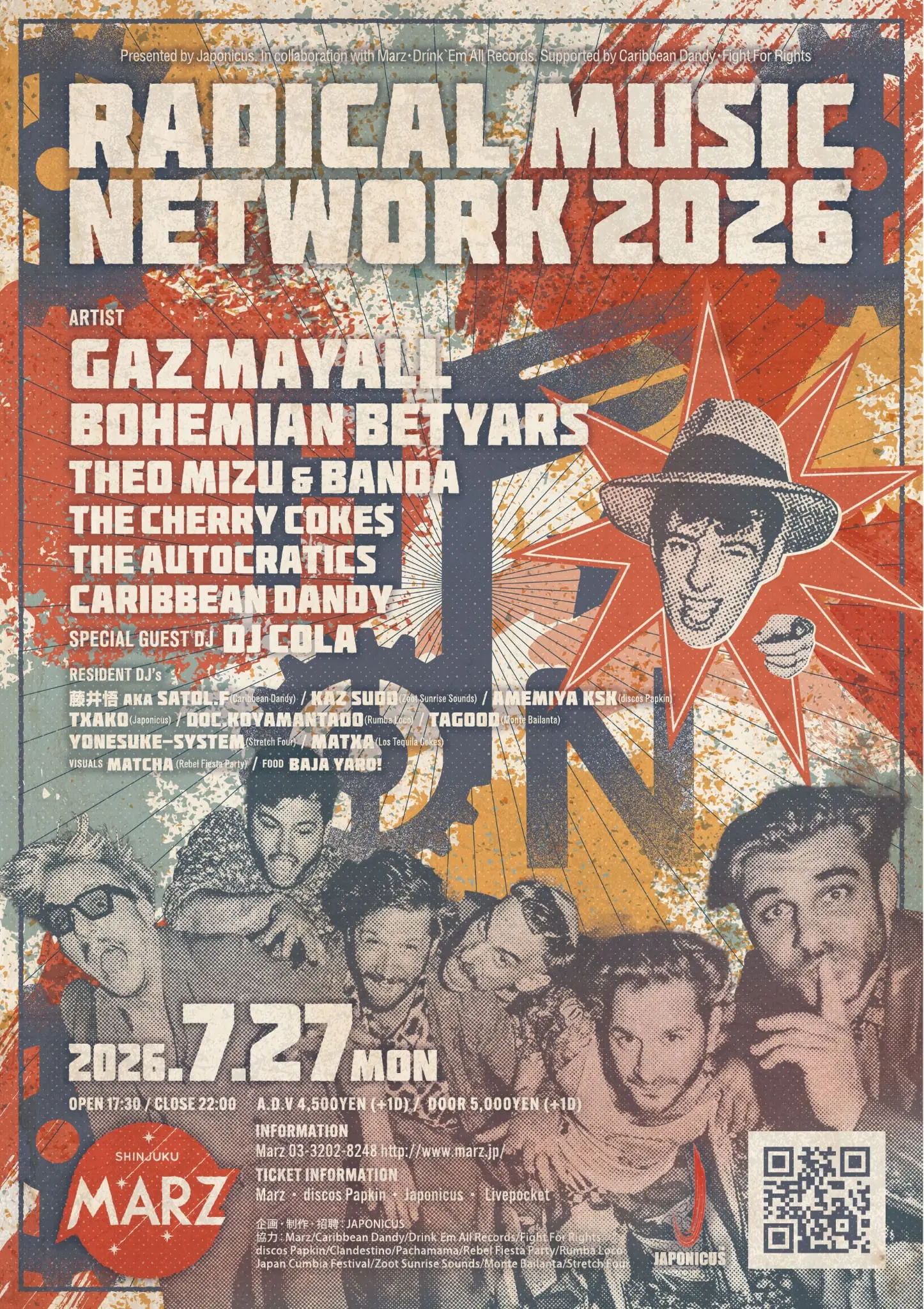 出演者 GAZ MAYALL / BOHEMIAN BETYARS / THEO MIZU & BANDA / CHERRY COKE$ / THE AUTOCRATICS / CARIBBEAN DANDY / DJ COLA / 藤井悟 aka SATOL.F / KAZ SUDO / AMEMIYA KSK / TXAKO / DOC.KOYAMANTADO / TAGOOD / YONESUKE-SYSTEM / MATXA