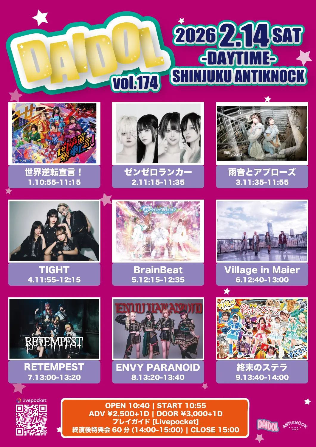 出演者 TIGHT / 世界逆転宣言! / Village in Maier / 雨音とアプローズ / RETEMPEST / 終末のステラ / ENVY PARANOID / BrainBeat / ゼンゼロランカー