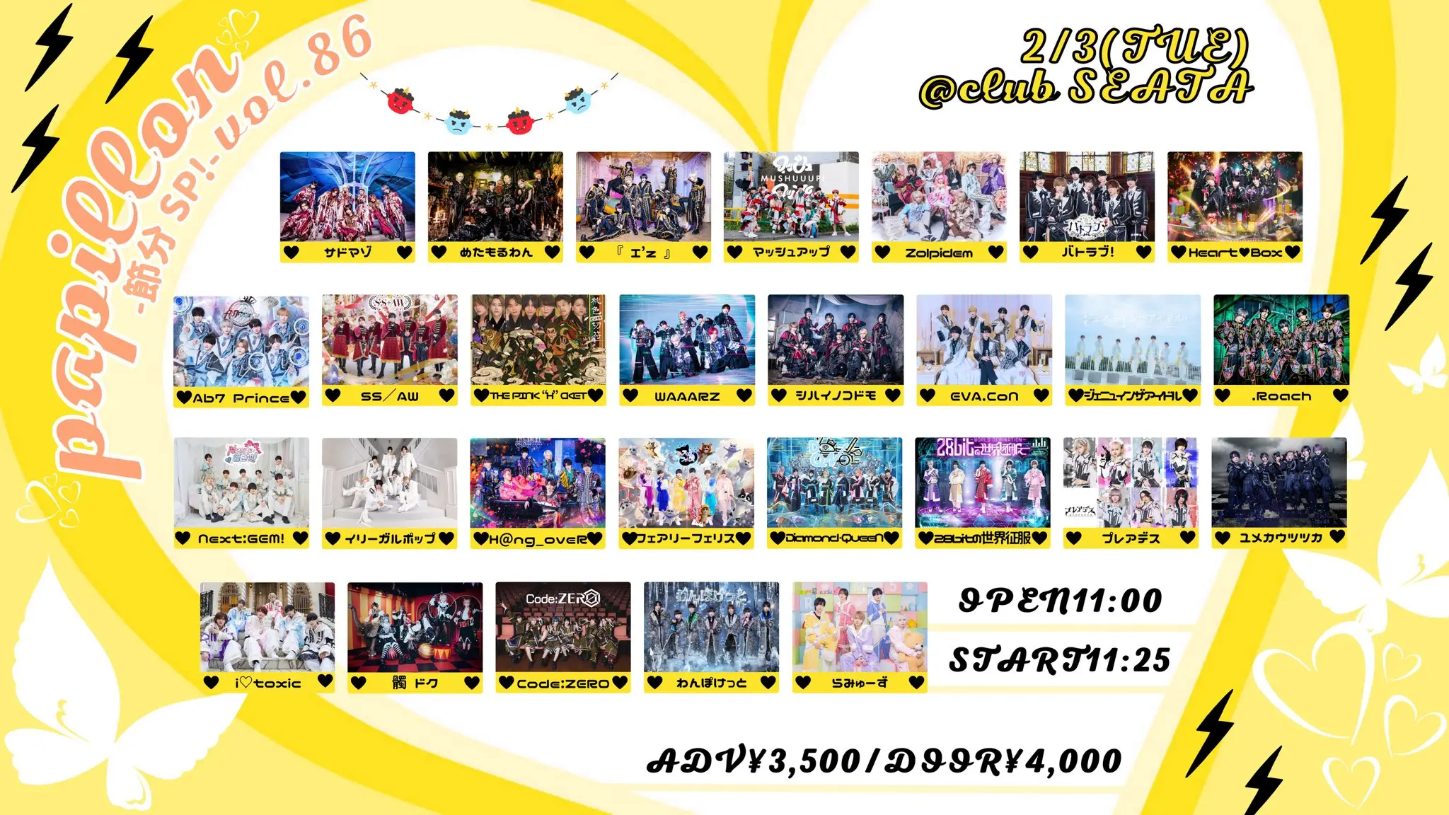 出演者 サドマゾ / めたもるわん / 『 I’z 』 / マッシュアップ / Zolpidem / バトラブ! / Heart❤︎Box / Ab7 Prince / SS/AW / THE PINK “H” CKET / WAAARZ / シハイノコドモ / EVA.CoN / ジェニュインザアイドル / .Roach / Next:GEM! / イリーガルポップ / H@ng_oveR / フェアリーフェリス / Diamond・QueeN / 28bitの世界征服 / プレアデス / ユメカウツツカ / i♡toxic / 髑 ドク / Code:ZERO / わんぽけっと / らみゅーず