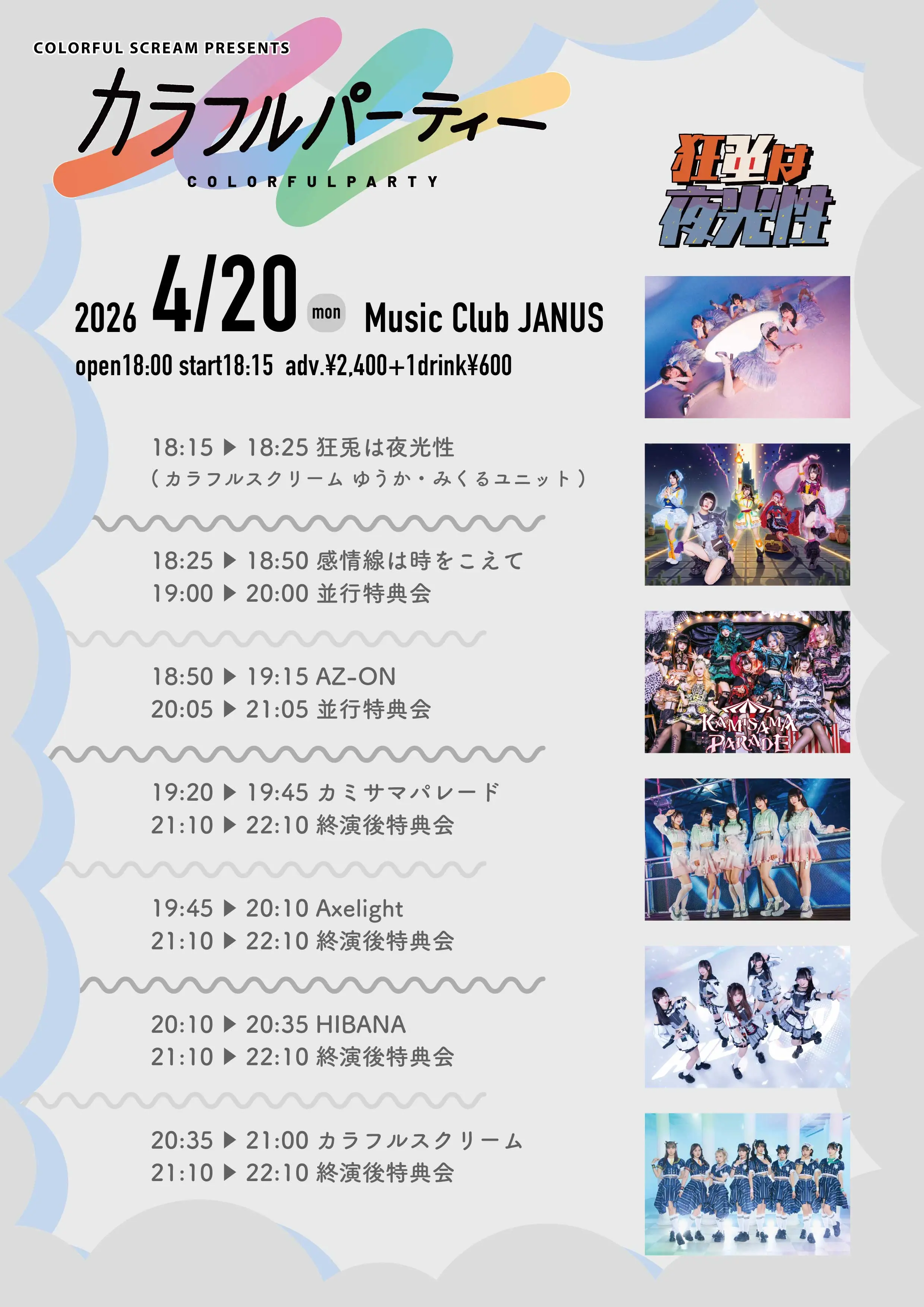 出演者 カラフルスクリーム / HIBANA / Axelight / カミサマパレード / AZ-ON / 感情線は時をこえて / 狂兎は夜光性