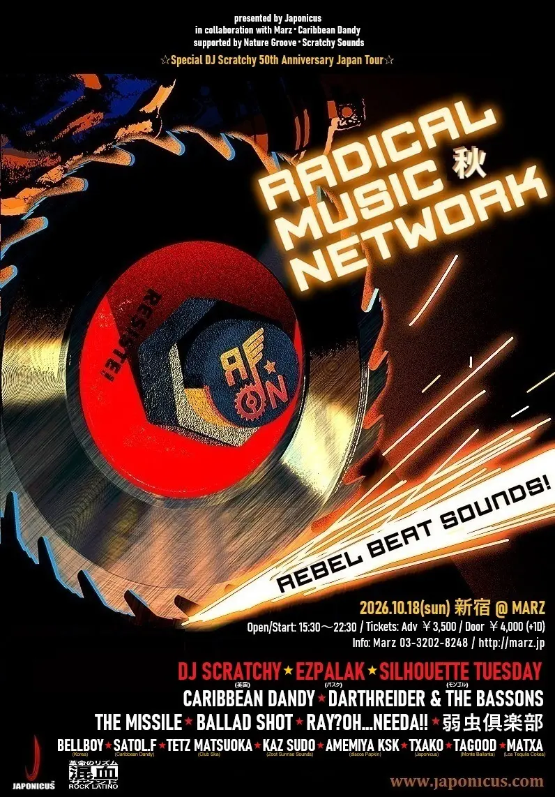 出演者 藤井悟 aka SATOL.F / KAZ SUDO / AMEMIYA KSK / TXAKO / TAGOOD / MATXA / DJ SCRATCHY / EZPALAK / SILHOUETTE TUESDAY / DARTHREIDER & THE BASSONS / THE MISSILE / BALLAD SHOT / RAY?OH...NEEDA!! / 弱虫俱楽部 / CARIBBEAN DANDY