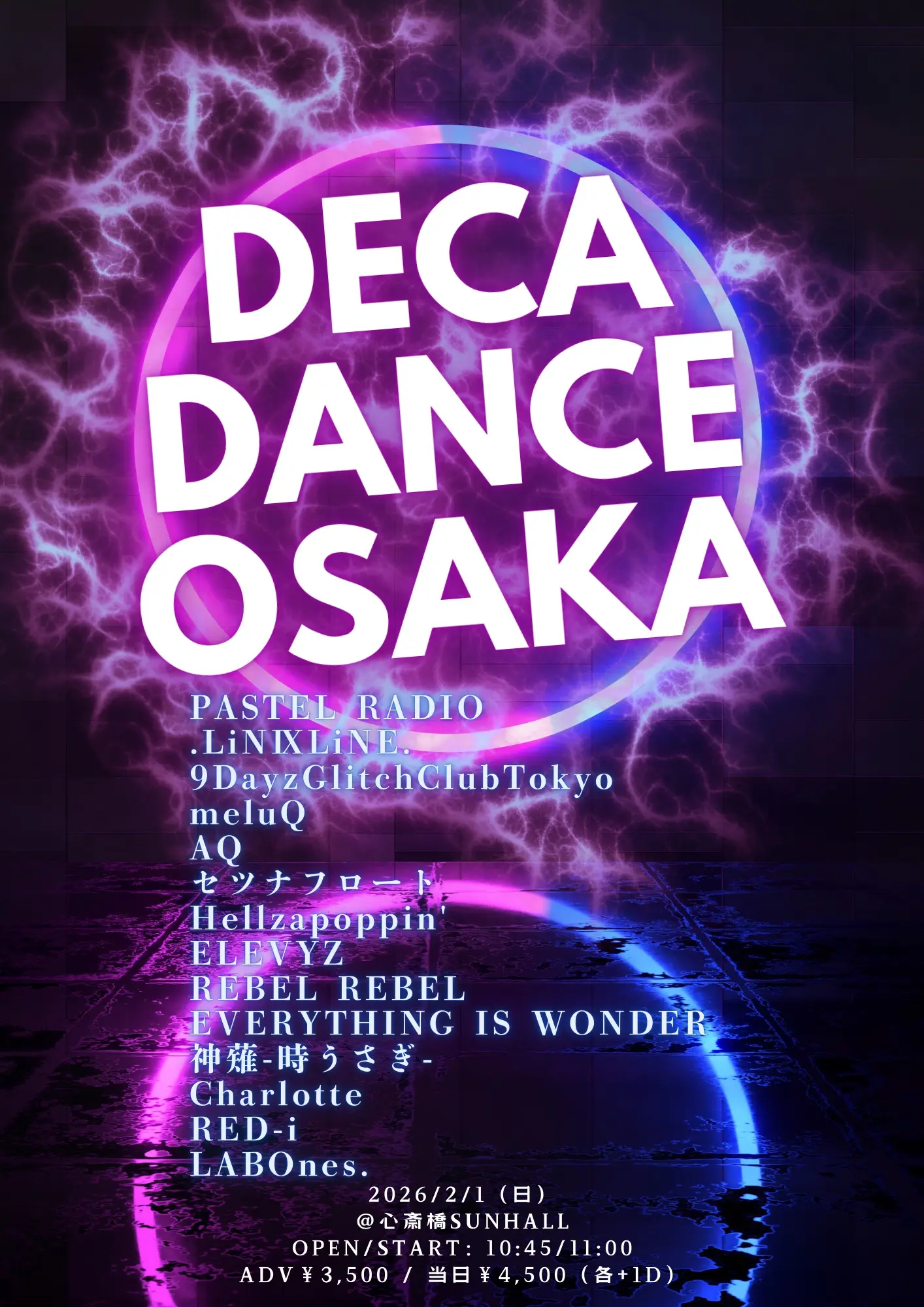 出演者 PASTEL RADIO / LABOnes. / .LiNⅨLiNE. / 9DayzGlitchClubTokyo / meluQ / AQ / セツナフロート / Hellzapoppin' / ELEVYZ / REBEL REBEL / EVERYTHING IS WONDER / 神薙-時うさぎ- / Charlotte / RED-i