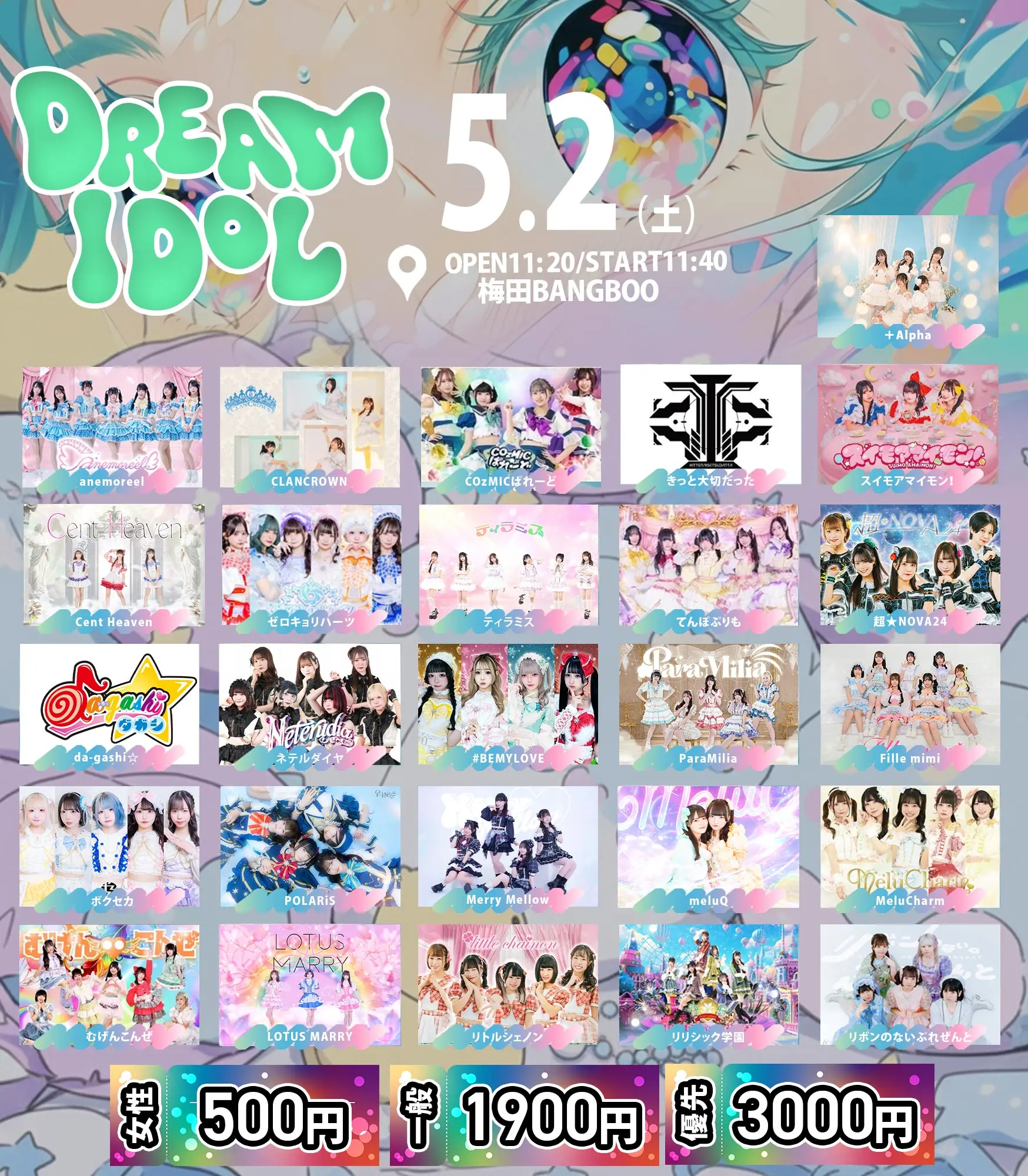 出演者 #BEMYLOVE / ちぎょ / MerryMellow / イロハサクラ / LOTUS MARRY / リボンのないぷれぜんと / 抜けてるくらいがちょうどいい / ChanceMovement / ➕Alpha / グットクルー / みらくらんど / あおぞらをキミに / TIPINKIT / Hi-Fi GIRLs PROJECT osaka Poifull / 感情線は時を超えて / ミケネコガールズ / da-gashi☆ / asterhythm⁂lumina / Krown Krown / anemoreel / リリシック学園 / BABEL / アクアリウム / ParaMilia / CLANCROWN / ➕Alpha