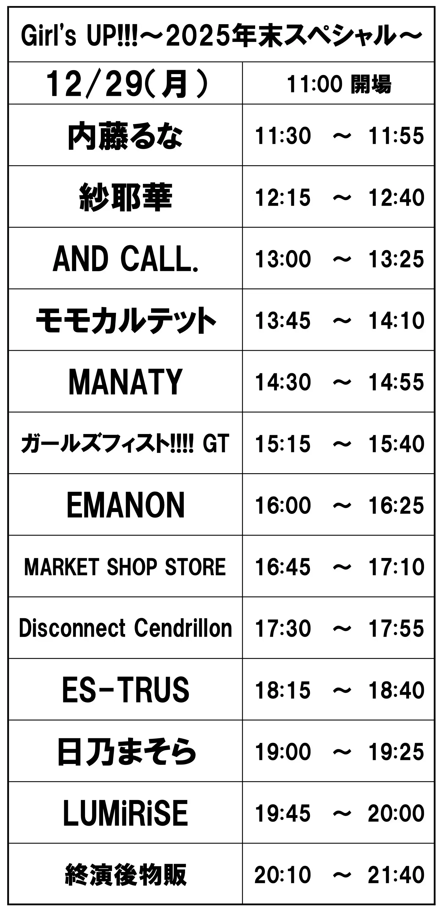 出演者 Disconnect Cendrillon / ガールズフィスト!!!! GT / EMANON / 内藤るな / LUMiRiSE / 日乃まそら / MANATY / AND CALL. / モモカルテット / MARKET SHOP STORE / 紗耶華 / ES-TRUS