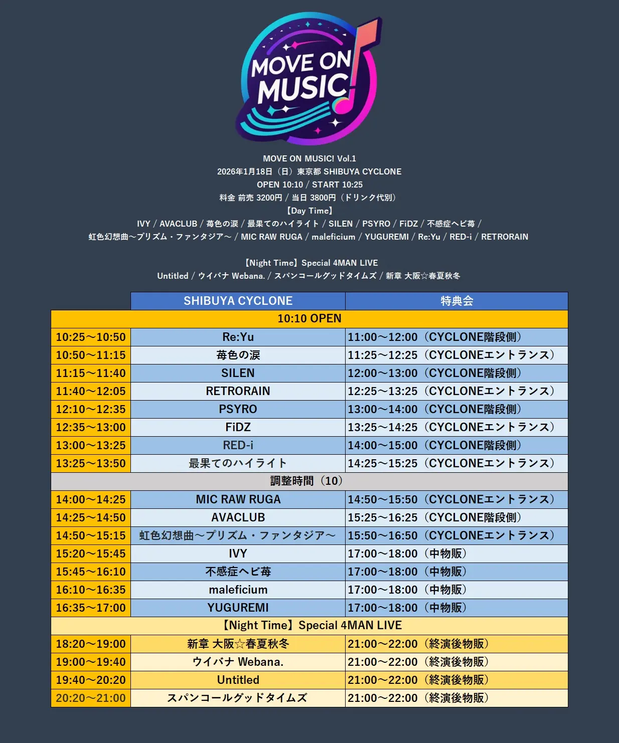 出演者 THE+BETH / DA・BAMBI / ウイバナ / セツナソウ / YUGUREMI / RETRORAIN / INSRiA / BABYTANTS / 最果てのハイライト / ろりぽっぷ!!!!!!! / UPローチ / FiDZ / Hellzapoppin' / WT☆Egret / -天- / QUON / SILEN / 会心ノ一撃 / JINKS / IVY / PSYRO / Brave Mental Orchestra / LumiDay / ミライサガシ / Tri-Sphere / ΩMG
