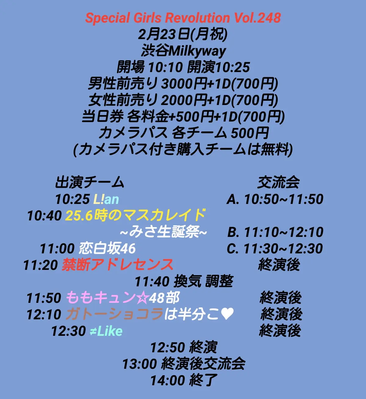 出演者 L!an / 25.6時のマスカレイド~みさ生誕祭~ / 恋白坂46 / 禁断アドレセンス / ももキュン☆48部 / ガトーショコラは半分こ♡ / ≠Like