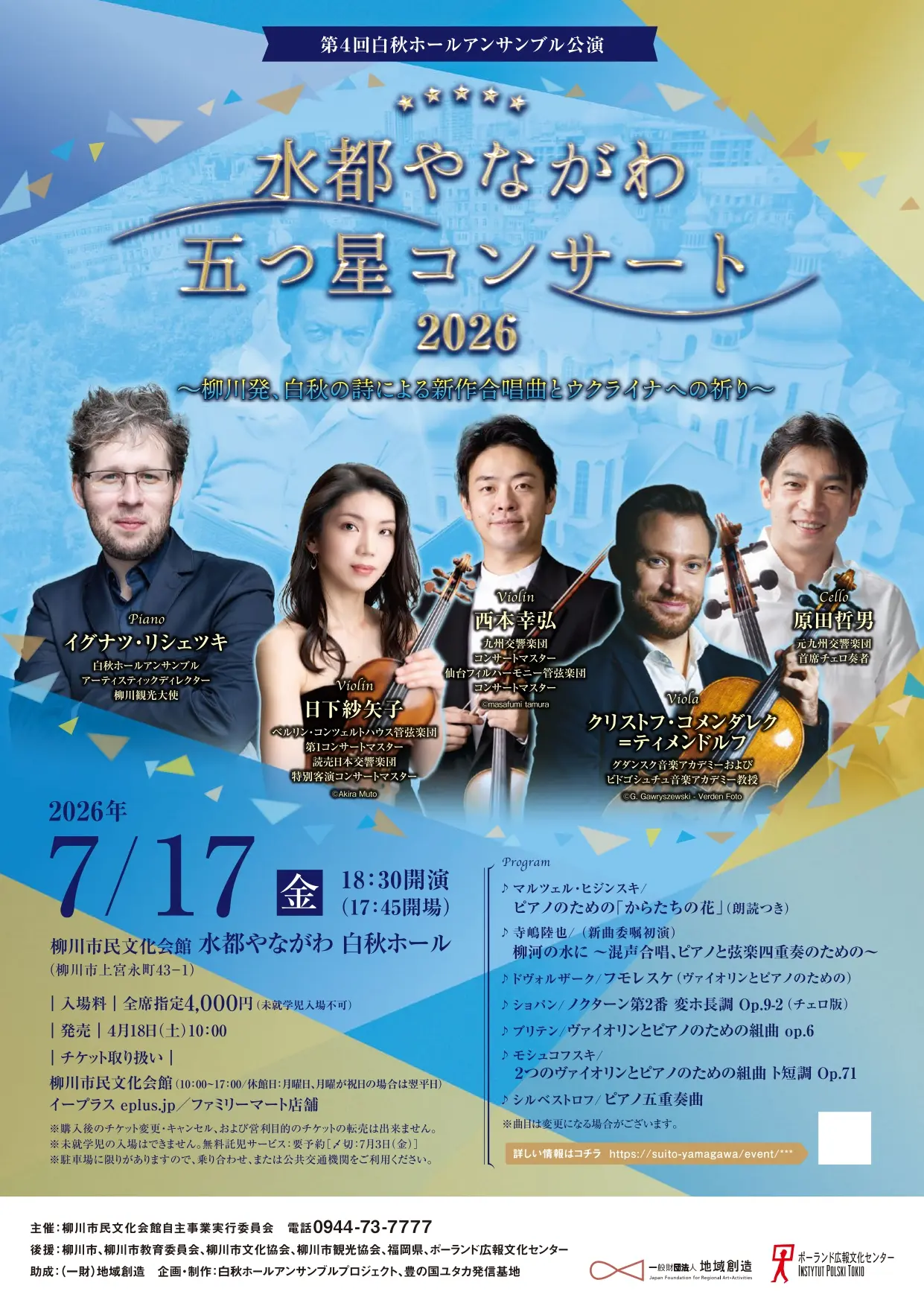 出演者 イグナツ・リシェツキ / 日下紗矢子(ヴァイオリン) / 西本幸弘(ヴァイオリン) / クリストフ・コメンダレク=ティメンドル(ヴィオラ) / 原田哲男(チェロ) / 菊村隆史(指揮)